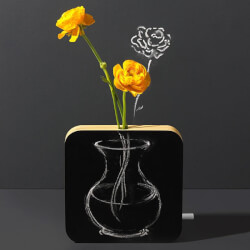Give your favorite art lover a modernist's delight with this Chalkboard Vase designed by Ricardo Saint-Clair. A part of the Museum of Modern Art (MoMA) product collection, this budding classic combines form and function with eye-catching results. The blocky base is part mid-century, part contemporary minimalism with a mixture of wood, laminate, and glass creating a slim profile with undeniable impact. The front doubles as a chalkboard, leaving plenty of space to write sweet nothings to a significant other or remind others in the household about important events or must-get items for the next grocery store run. A small glass tube sits nestled into the top of the case, providing a safe and secure home for a few stems of roses, daisies, or other pretty blooms. The vase can be mounted on the wall or perched on a desk, mantle, or pretty much any other horizontal surface - wherever there's a place of pride in the home this vase deserves to be. It makes a wonderful outside-the-box gift for holidays, anniversaries, birthdays, or even those rough weeks when a "just because" surprise would be particularly welcome. To take your gift way over the top, add a personalized chalk message that lets your special someone know how truly wonderful you think they are. Details: Suitable for the home or officeI ncluded piece of chalk tucks neatly into the side of the vase Made in China of plywood, laminate, and glass Includes hardware for wall mounting Spot clean with a damp cloth Hand wash glass tube